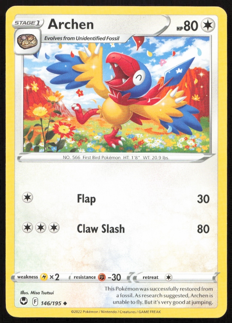 This Pokémon card, from 2022 is part of the Pokémon Sword & Shield – Silver Tempest card set. Archen is featured and has a card number of 146/195.