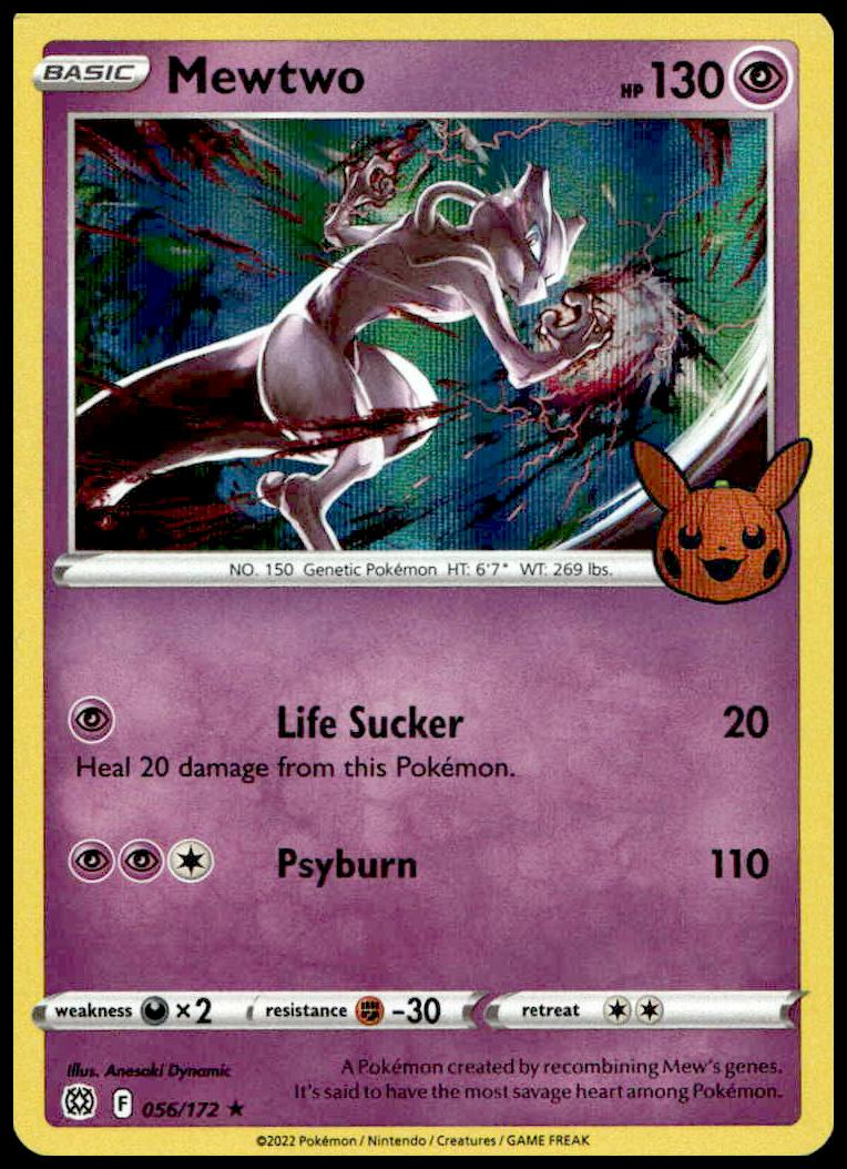 This Pokemon card, from 2022 is part of the Pokémon Sword & Shield – Trick or Trade 2022 card set. Mewtwo is featured and has a card number of 056/172.