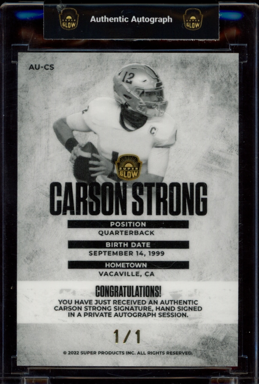 This Football card, from 2022 is part of the Super Glow card set. Carson Strong is featured and has a card number of AU-CS.
