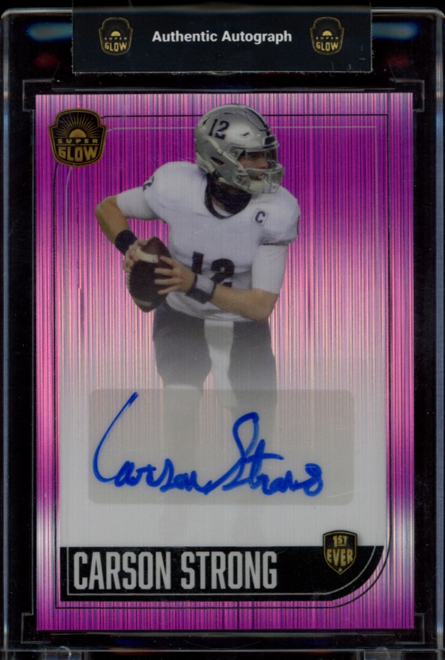 2022 Super Glow Carson Strong Dazzle Pink autographed card, featuring a unique design and limited edition. Perfect for collectors!