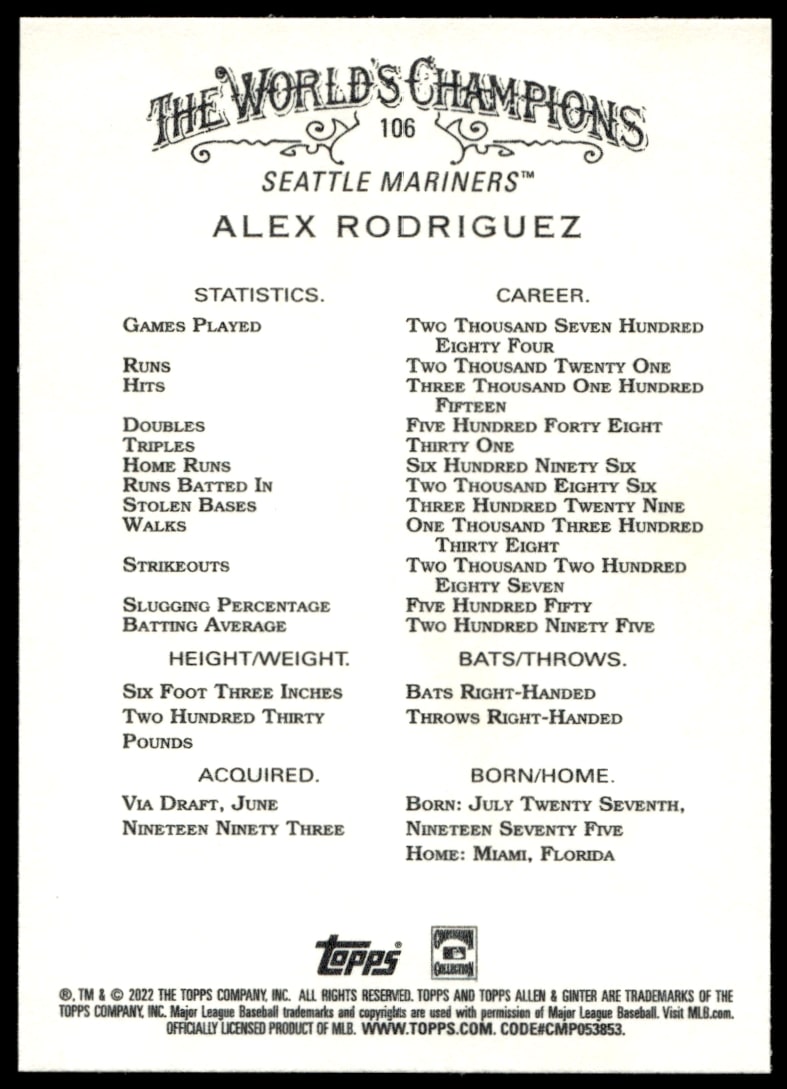 This Baseball card, from 2022 is part of the Topps Allen & Ginter card set. Alex Rodriguez is featured and has a card number of 106.