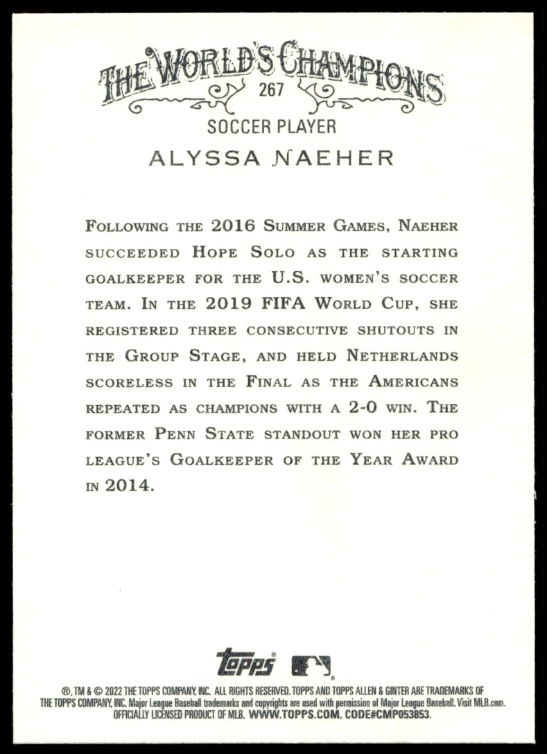 This Baseball card, from 2022 is part of the Topps Allen & Ginter card set. Alyssa Naeher is featured and has a card number of 267.