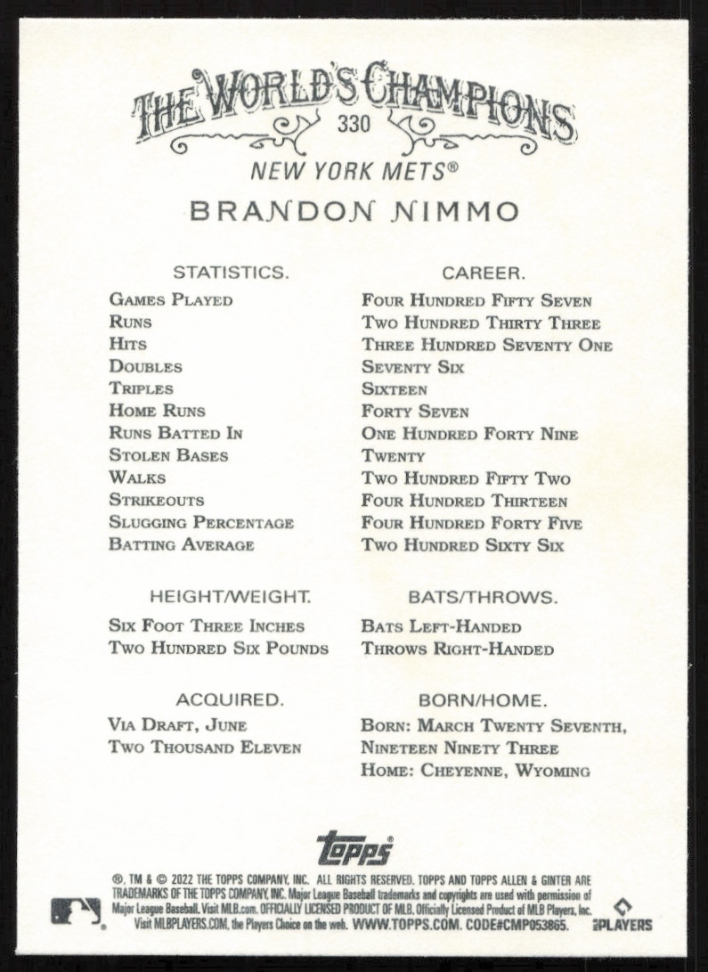 This Baseball card, from 2022 is part of the Topps Allen & Ginter card set. Brandon Nimmo is featured and has a card number of 330.