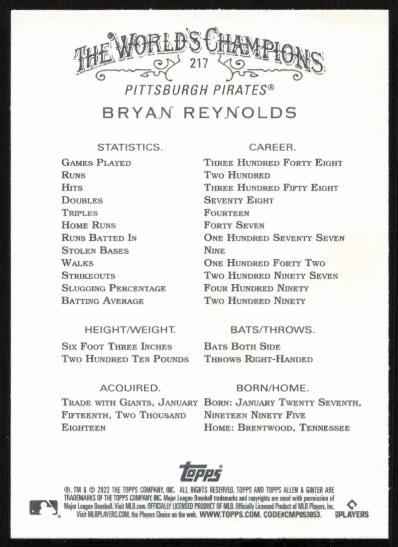 This Baseball card, from 2022 is part of the Topps Allen & Ginter card set. Bryan Reynolds is featured and has a card number of 217.