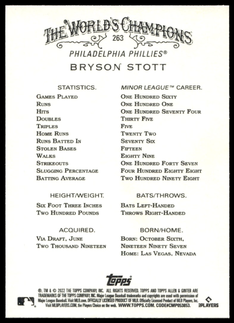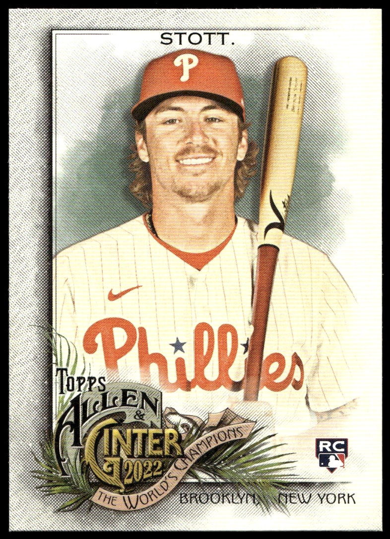 This BaseballΒ card, from 2022 is part of the Topps Allen & GinterΒ card set. Bryson Stott is featured and has a card number of 256.