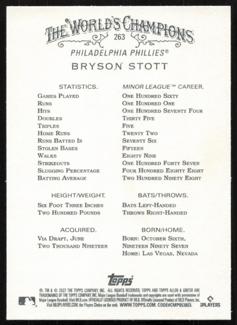 This Baseball card, from 2022 is part of the Topps Allen & Ginter card set. Bryson Stott is featured and has a card number of 263.