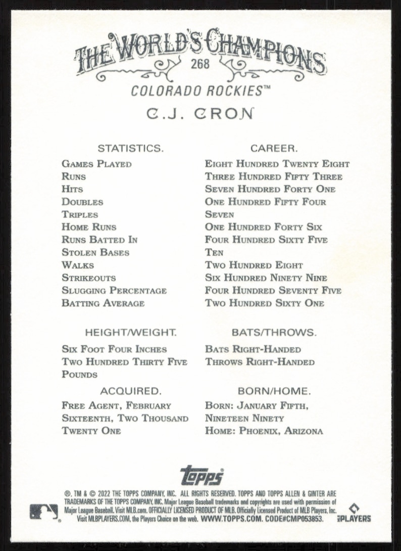 This Baseball card, from 2022 is part of the Topps Allen & Ginter card set. C.J. Cron is featured and has a card number of 268.