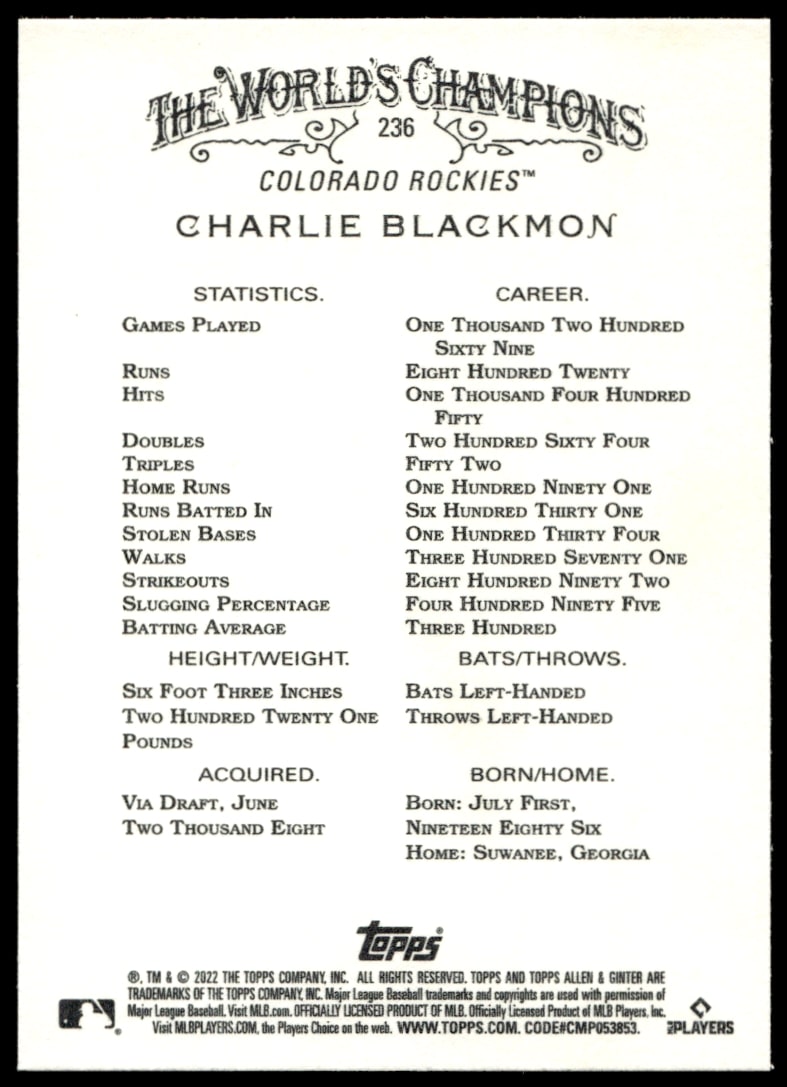 This Baseball card, from 2022 is part of the Topps Allen & Ginter card set. Charlie Blackmon is featured and has a card number of 236.