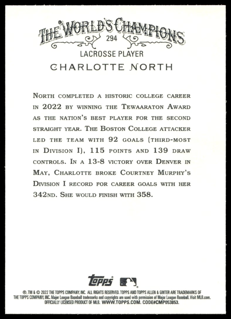 This BaseballΒ card, from 2022 is part of the Topps Allen & GinterΒ card set. Charlotte North is featured and has a card number of 294.