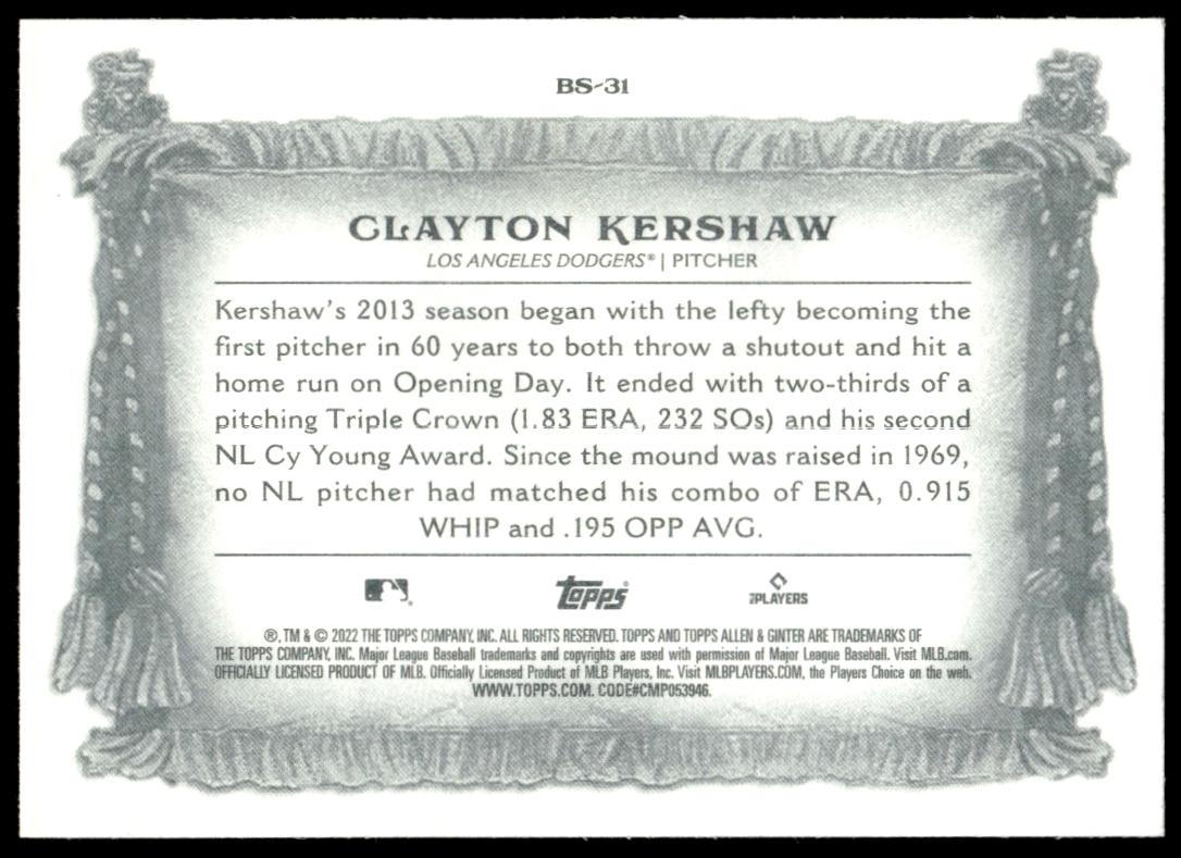 This BaseballΒ card, from 2022 is part of the Topps Allen & GinterΒ card set. Clayton Kershaw is featured and has a card number of BS-31.