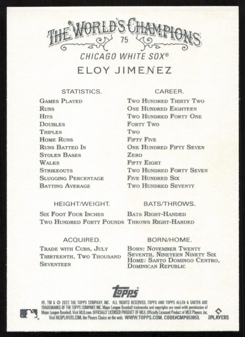 This Baseball card, from 2022 is part of the Topps Allen & Ginter card set. Eloy Jimenez is featured and has a card number of 75.