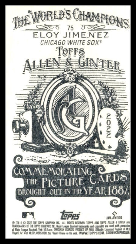 This Baseball card, from 2022 is part of the Topps Allen & Ginter card set. Eloy Jimenez is featured and has a card number of 75.