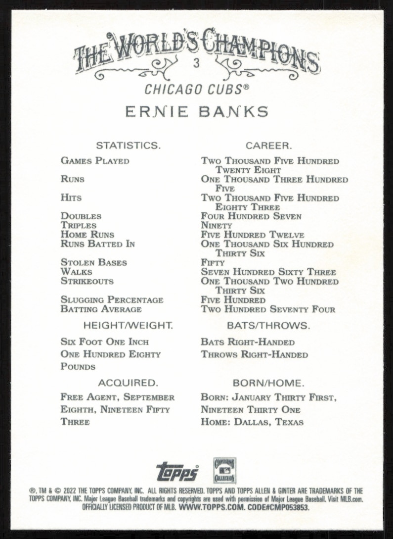 This Baseball card, from 2022 is part of the Topps Allen & Ginter card set. Ernie Banks is featured and has a card number of 3.