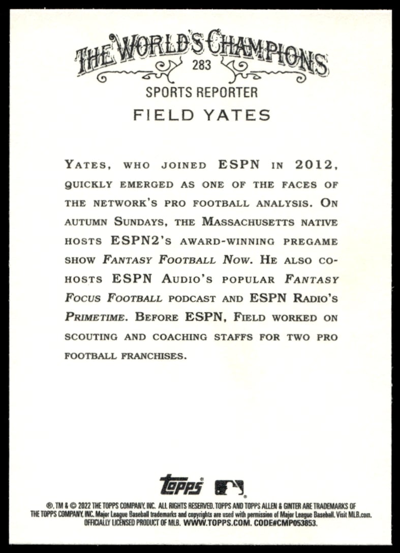This Baseball card, from 2022 is part of the Topps Allen & Ginter card set. Field Yates is featured and has a card number of 283.