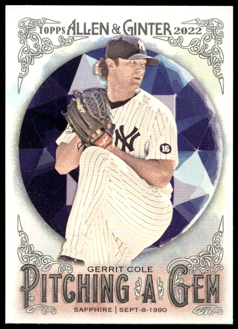 This Baseball card, from 2022 is part of the Topps Allen & Ginter card set. Gerrit Cole is featured and has a card number of PAG-25.