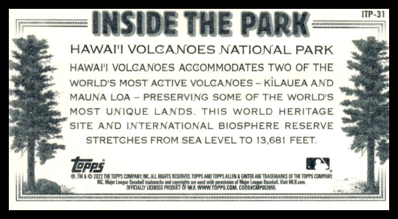 This Baseball card, from 2022 is part of the Topps Allen & Ginter card set. Hawai’i Volcanoes National Park is featured and has a card number of ITP-31.