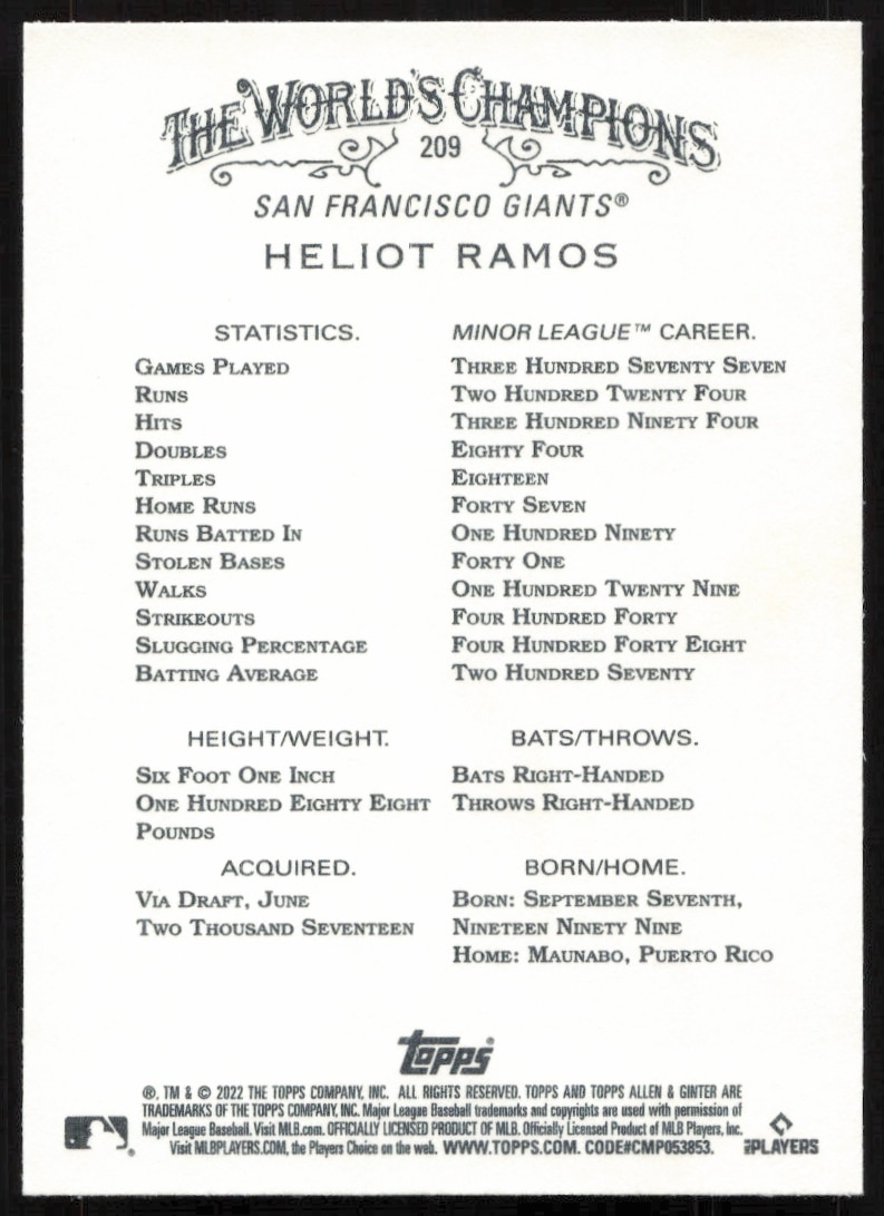 This Baseball card, from 2022 is part of the Topps Allen & Ginter card set. Heliot Ramos is featured and has a card number of 209.
