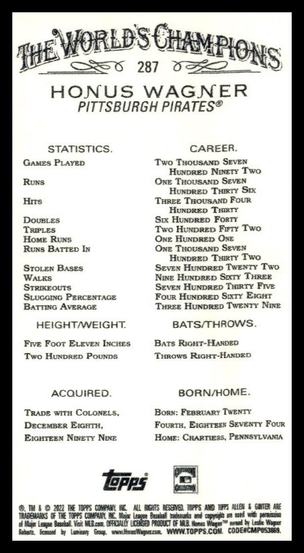 This Baseball card, from 2022 is part of the Topps Allen & Ginter card set. Honus Wagner is featured and has a card number of 287.