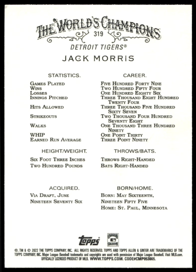 This BaseballΒ card, from 2022 is part of the Topps Allen & GinterΒ card set. Jack Morris is featured and has a card number of 319.