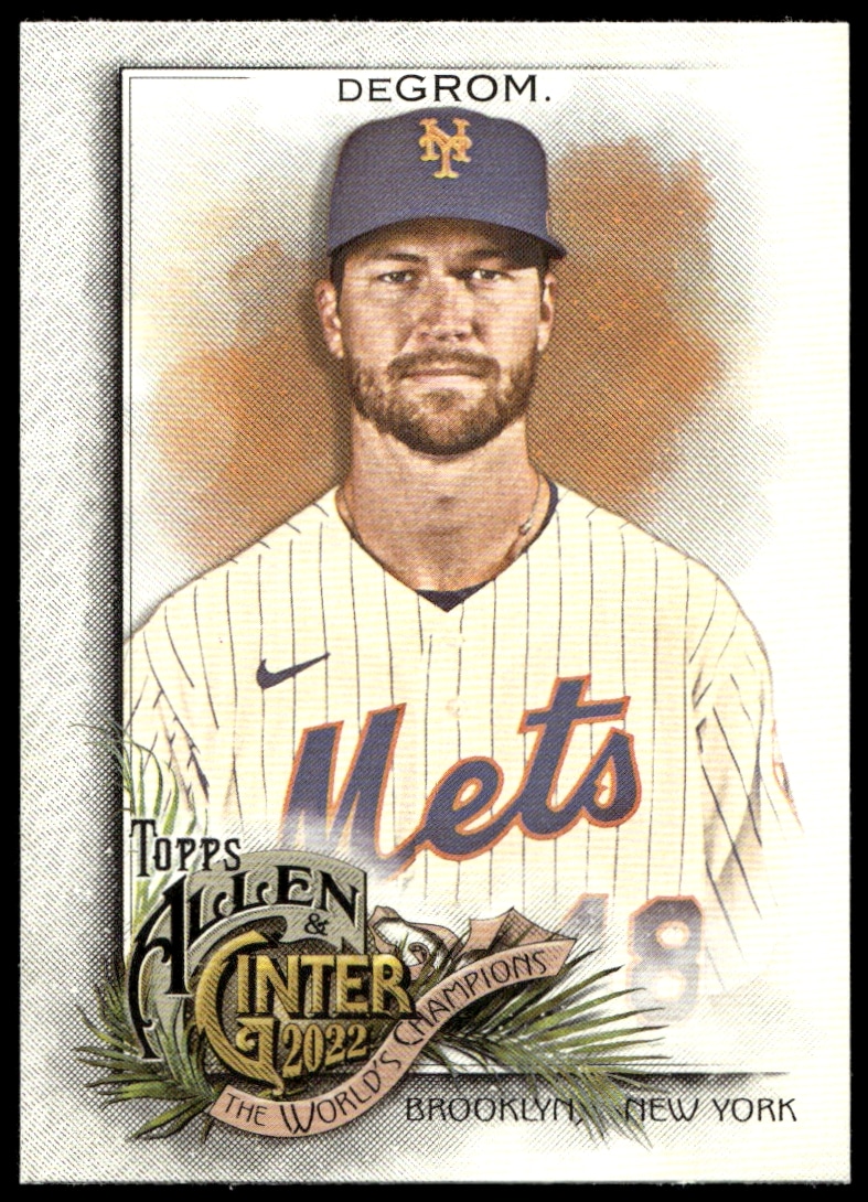 This Baseball card, from 2022 is part of the Topps Allen & Ginter card set. Jacob deGrom is featured and has a card number of 6.