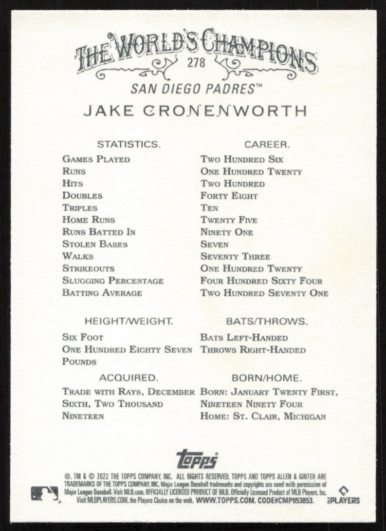 This Baseball card, from 2022 is part of the Topps Allen & Ginter card set. Jake Cronenworth is featured and has a card number of 278.
