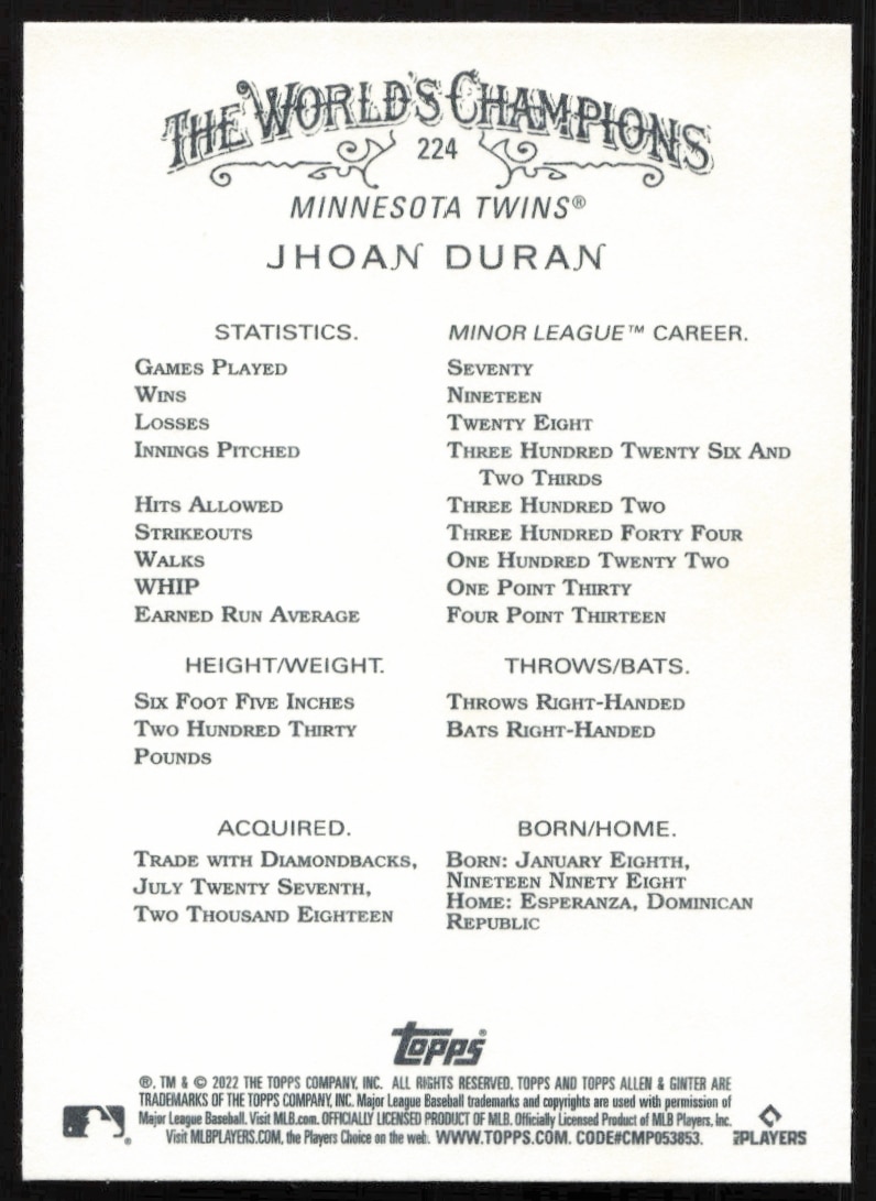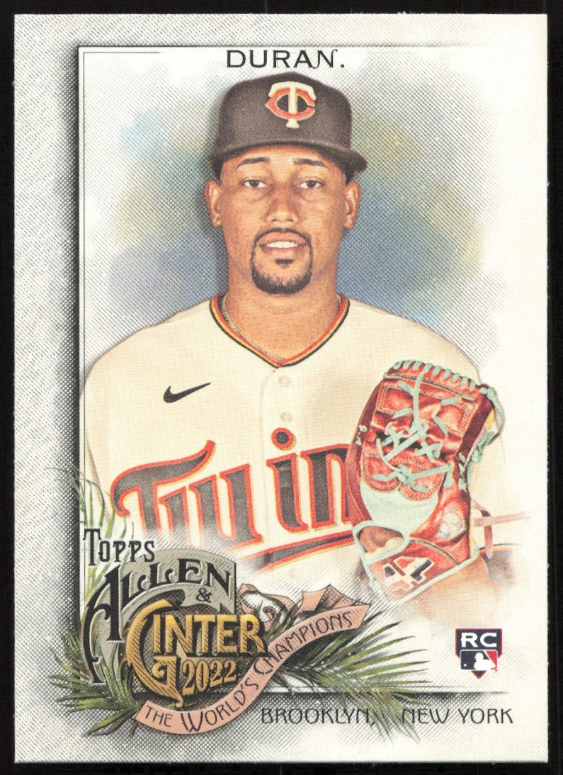 This Baseball card, from 2022 is part of the Topps Allen & Ginter card set. Jhoan Duran is featured and has a card number of 224.