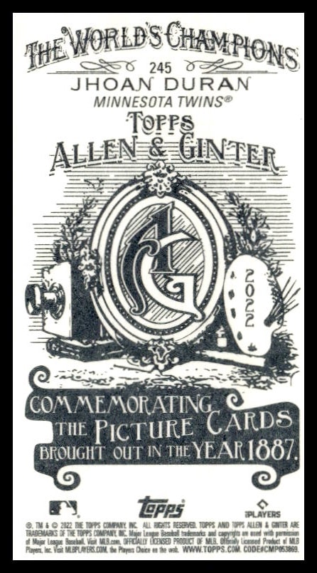 This BaseballΒ card, from 2022 is part of the Topps Allen & GinterΒ card set. Jhoan Duran is featured and has a card number of 245.