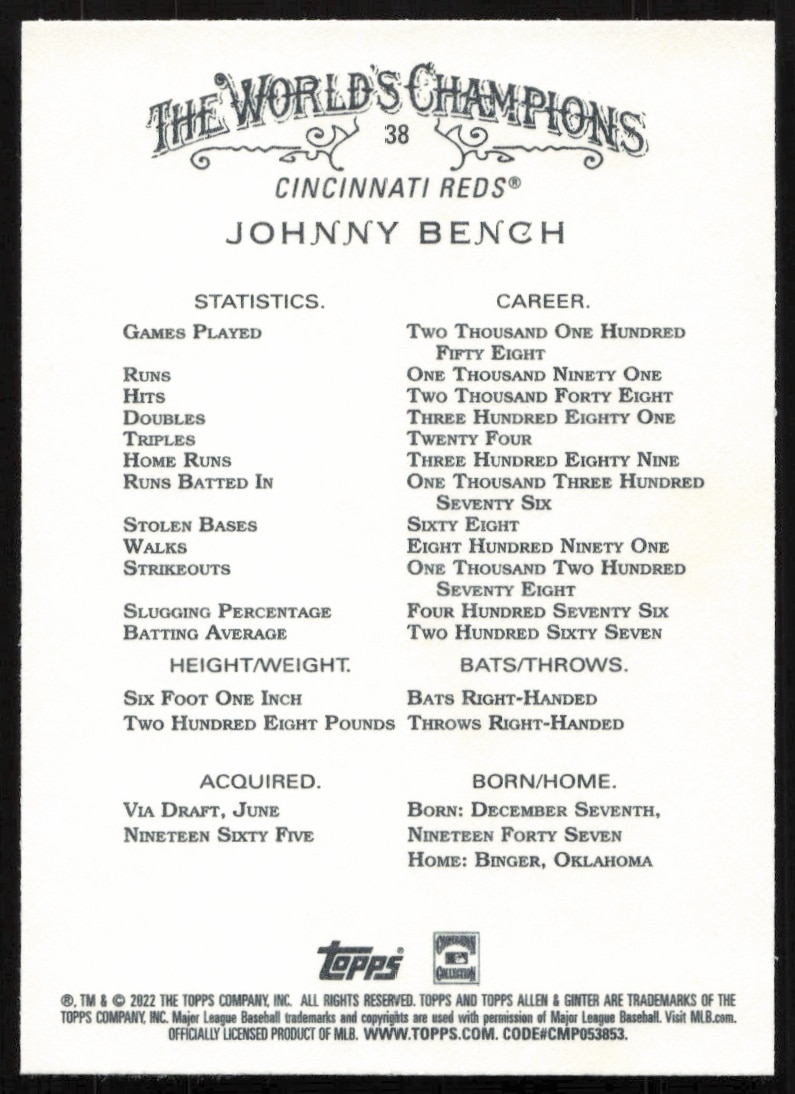 This Baseball card, from 2022 is part of the Topps Allen & Ginter card set. Johnny Bench is featured and has a card number of 38.