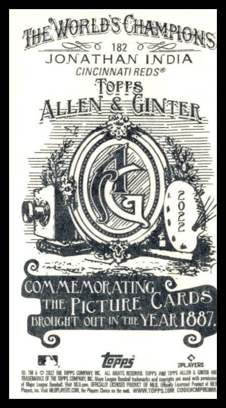 This BaseballΒ card, from 2022 is part of the Topps Allen & GinterΒ card set. Jonathan India is featured and has a card number of 182.
