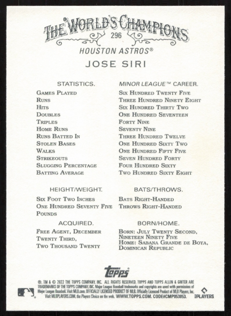 This Baseball card, from 2022 is part of the Topps Allen & Ginter card set. Jose Siri is featured and has a card number of 296.