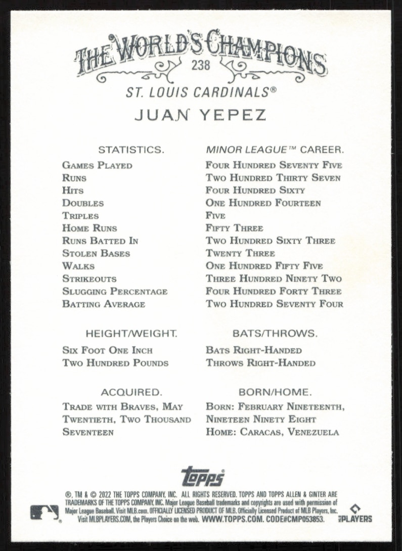 This Baseball card, from 2022 is part of the Topps Allen & Ginter card set. Juan Yepez is featured and has a card number of 238.