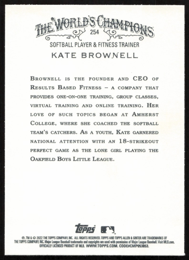 This Baseball card, from 2022 is part of the Topps Allen & Ginter card set. Kate Brownell is featured and has a card number of 254.