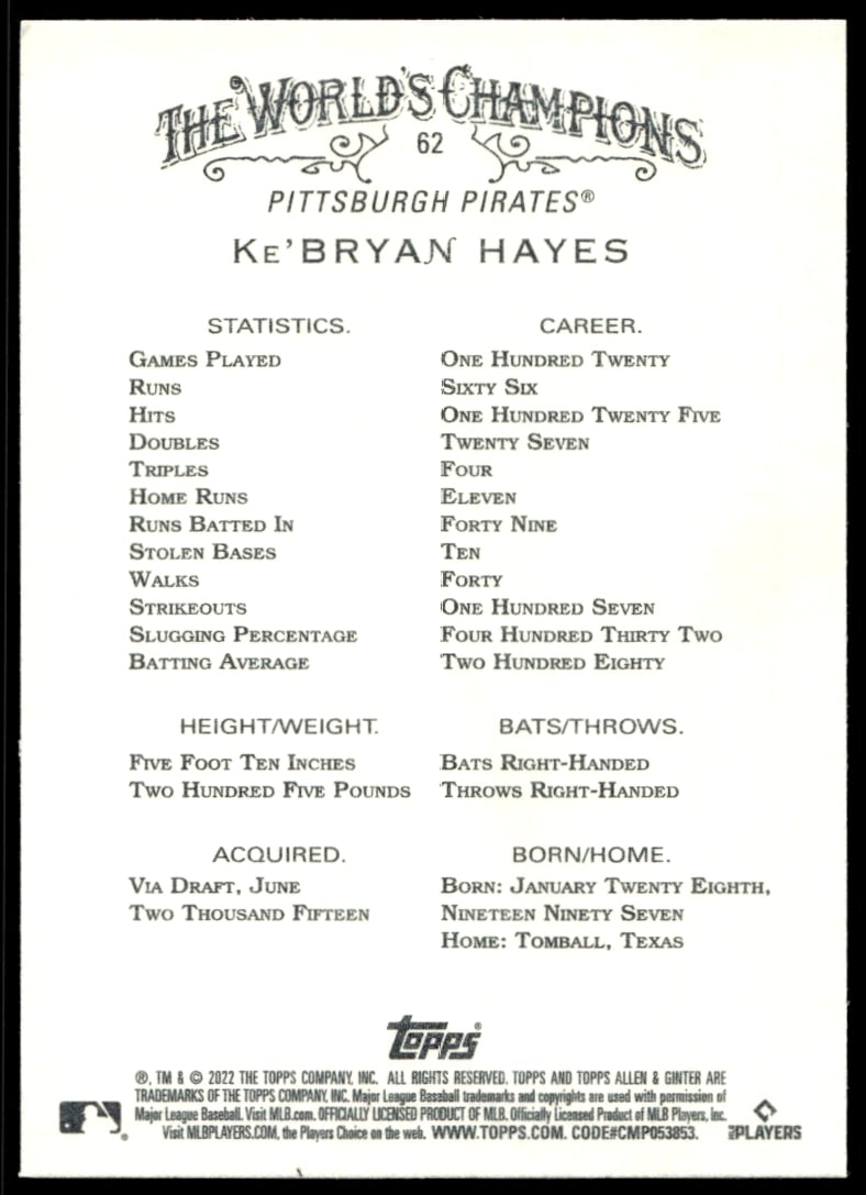This Baseball card, from 2022 is part of the Topps Allen & Ginter card set. Ke’Bryan Hayes is featured and has a card number of 62.