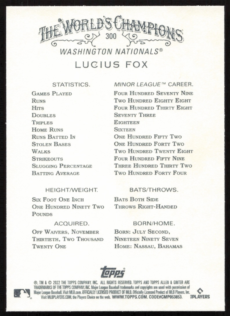 This Baseball card, from 2022 is part of the Topps Allen & Ginter card set. Lucius Fox is featured and has a card number of 300.
