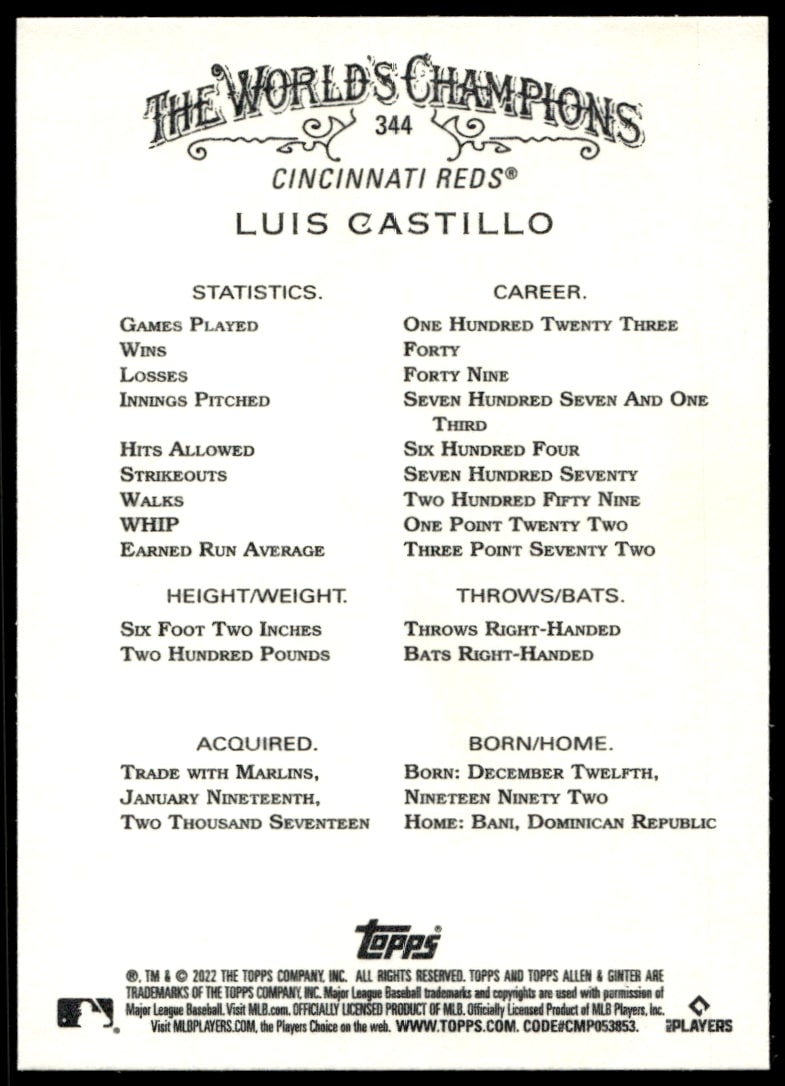 This BaseballΒ card, from 2022 is part of the Topps Allen & GinterΒ card set. Luis Castillo is featured and has a card number of 344.