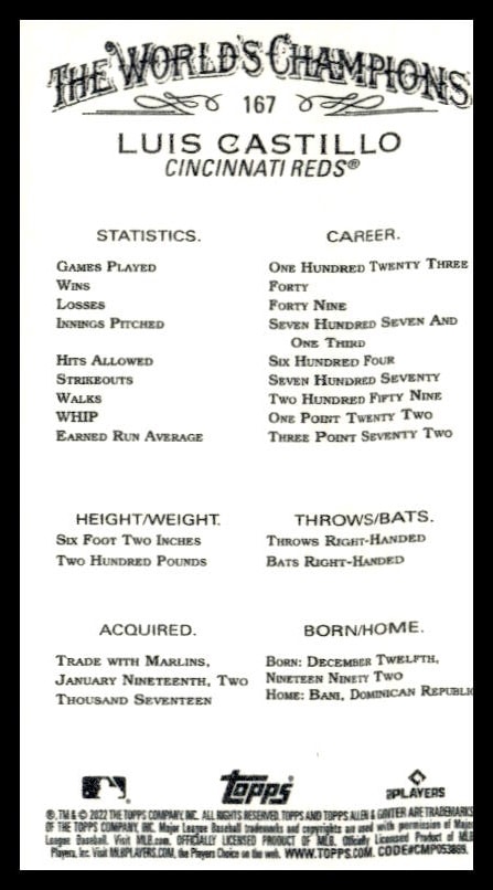 This Baseball card, from 2022 is part of the Topps Allen & Ginter card set. Luis Castillo is featured and has a card number of 167.