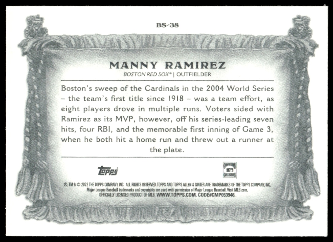 This BaseballΒ card, from 2022 is part of the Topps Allen & GinterΒ card set. Manny Ramirez is featured and has a card number of BS-38.