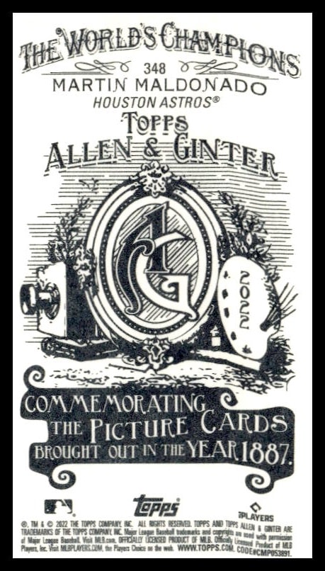 This Baseball card, from 2022 is part of the Topps Allen & Ginter card set. Martin Maldonado is featured and has a card number of 348.