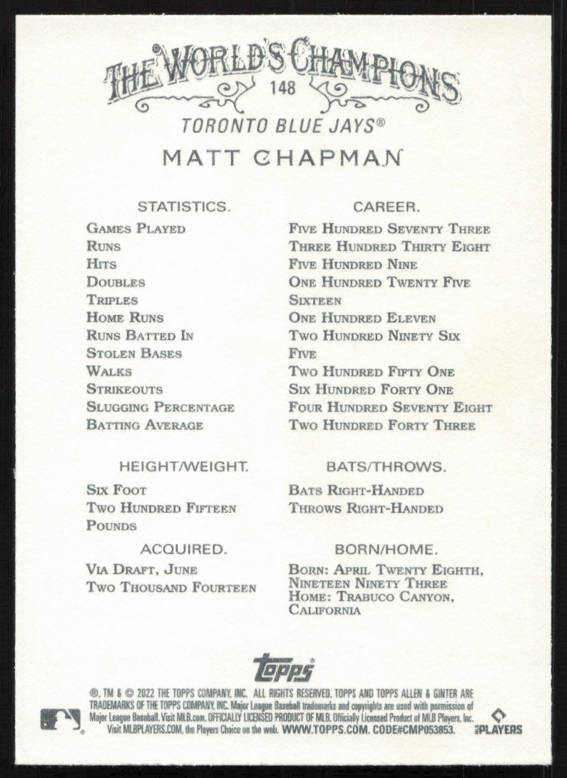 This Baseball card, from 2022 is part of the Topps Allen & Ginter card set. Matt Chapman is featured and has a card number of 148.