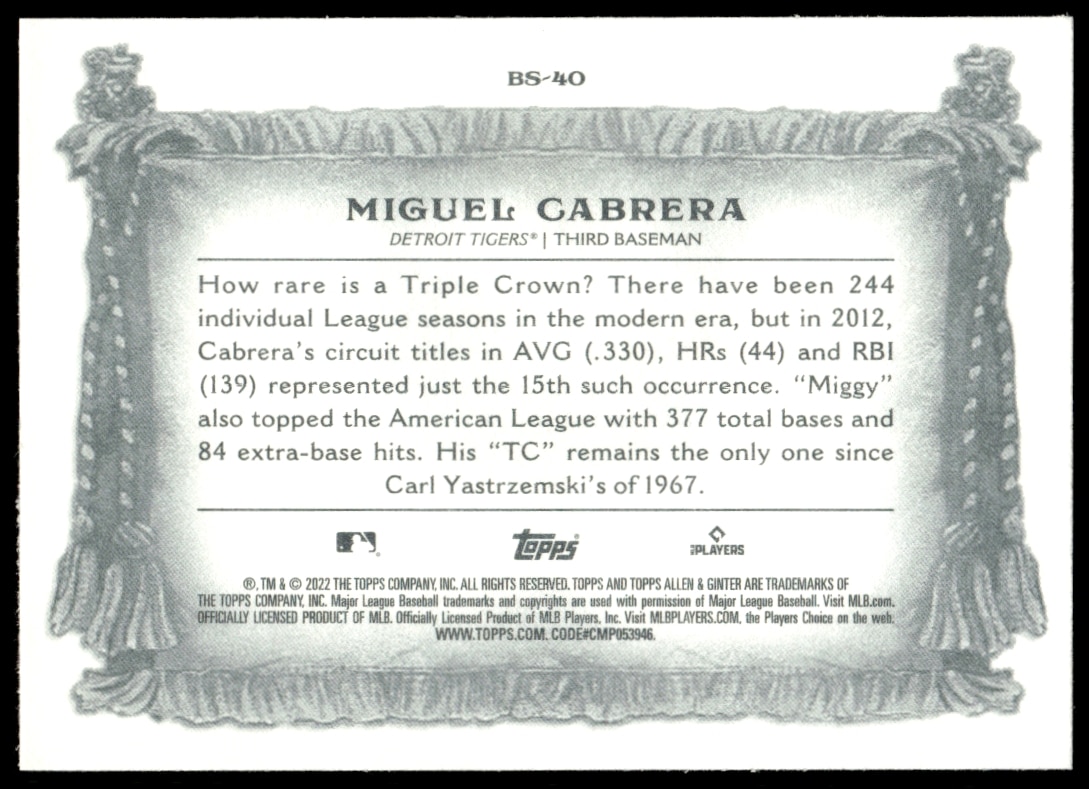 This Baseball card, from 2022 is part of the Topps Allen & Ginter card set. Miguel Cabrera is featured and has a card number of BS-40.