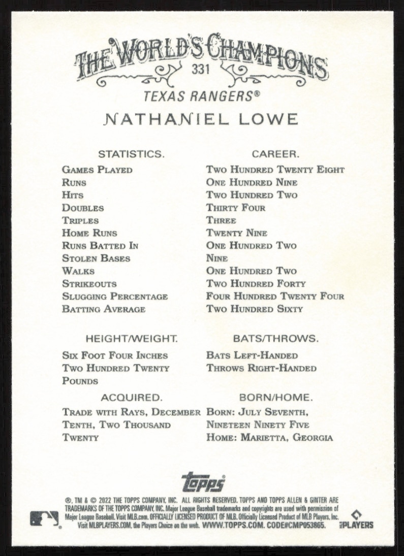 This Baseball card, from 2022 is part of the Topps Allen & Ginter card set. Nathaniel Lowe is featured and has a card number of 331.
