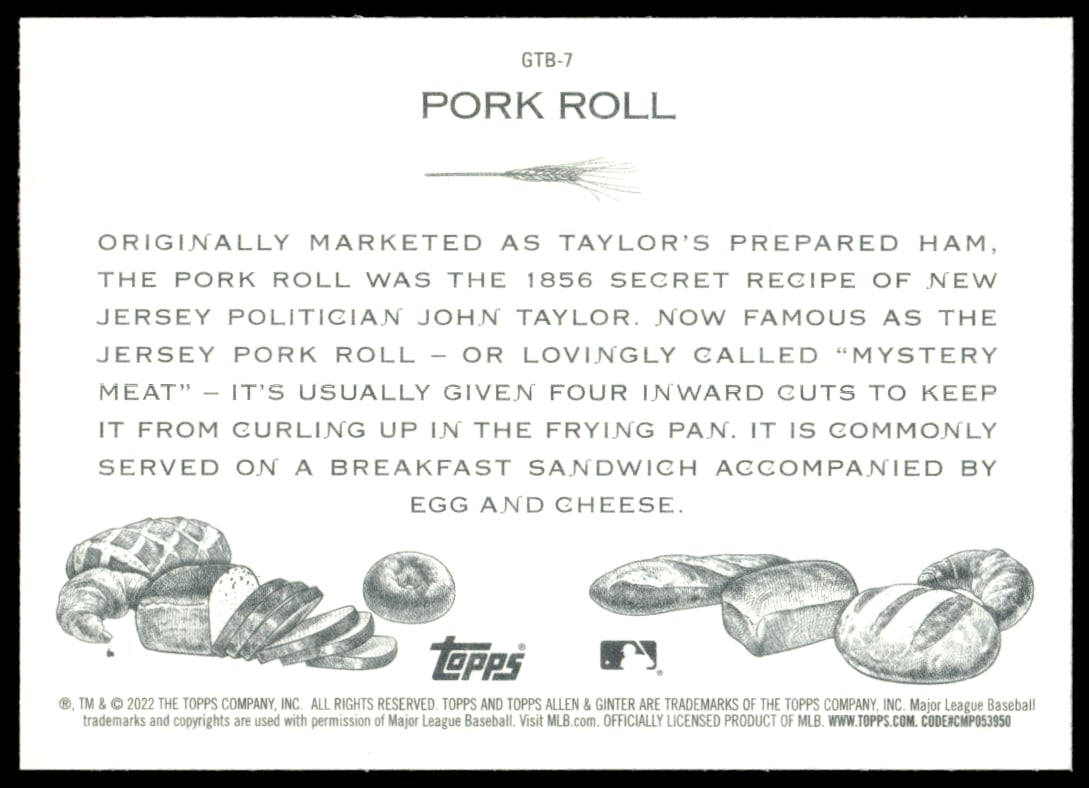 This Baseball card, from 2022 is part of the Topps Allen & Ginter card set. Pork Roll is featured and has a card number of GTB-7.