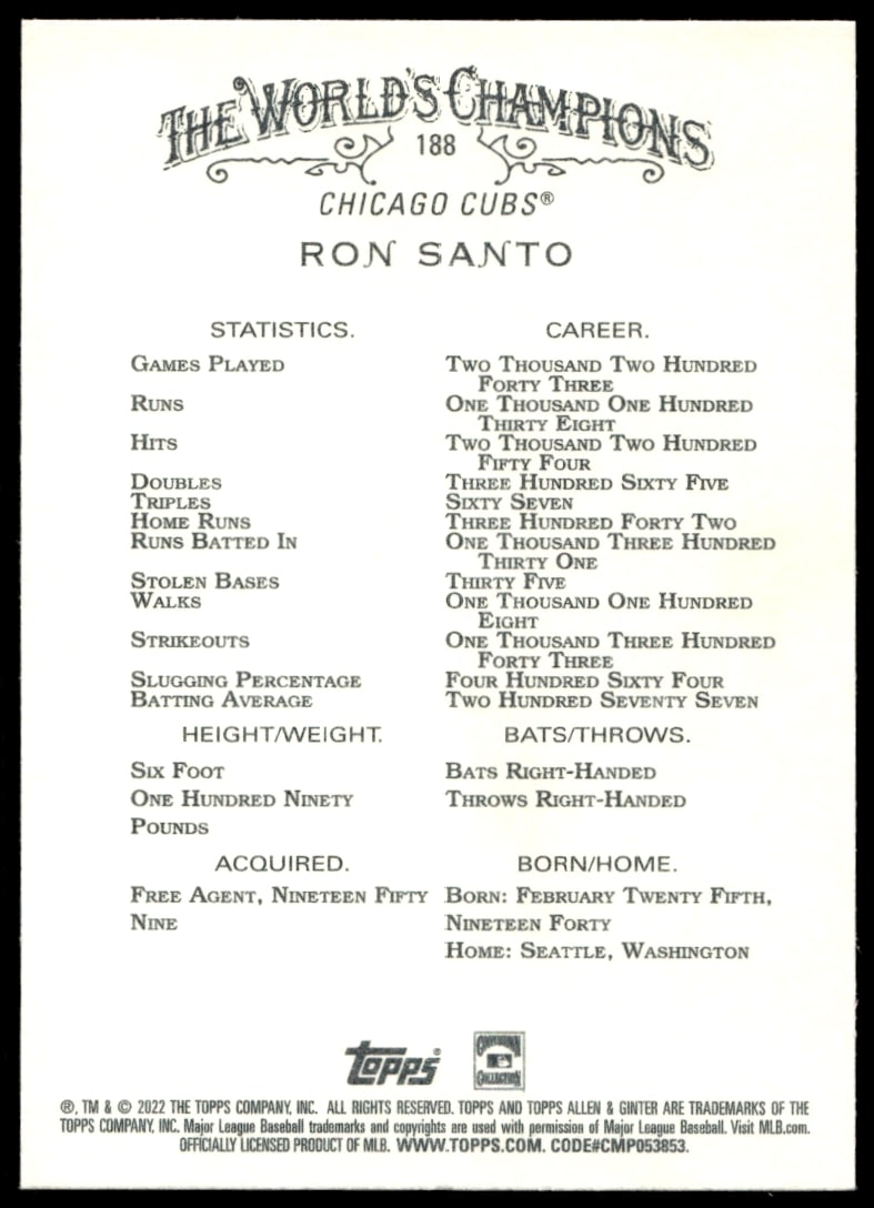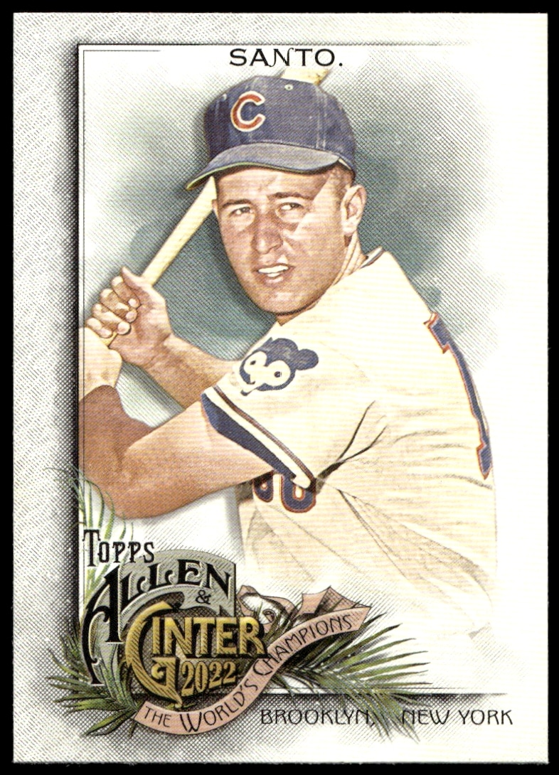 This Baseball card, from 2022 is part of the Topps Allen & Ginter card set. Ron Santo is featured and has a card number of 188.
