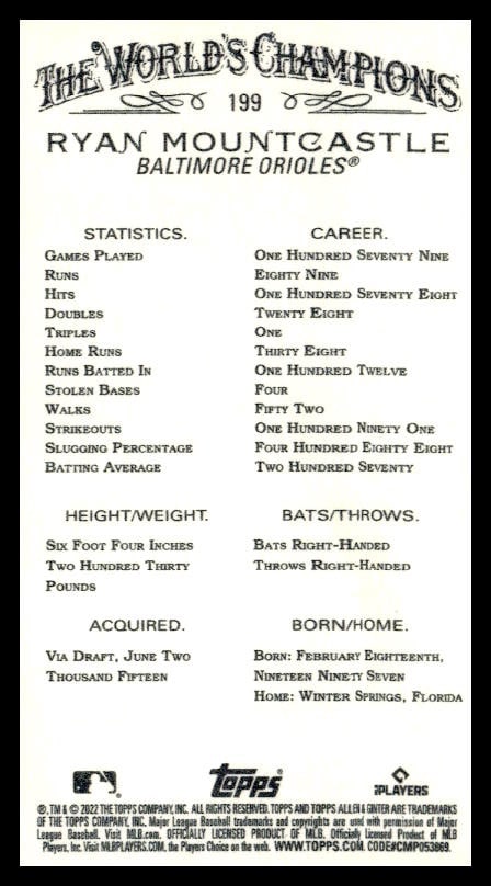 This Baseball card, from 2022 is part of the Topps Allen & Ginter card set. Ryan Mountcastle is featured and has a card number of 199.