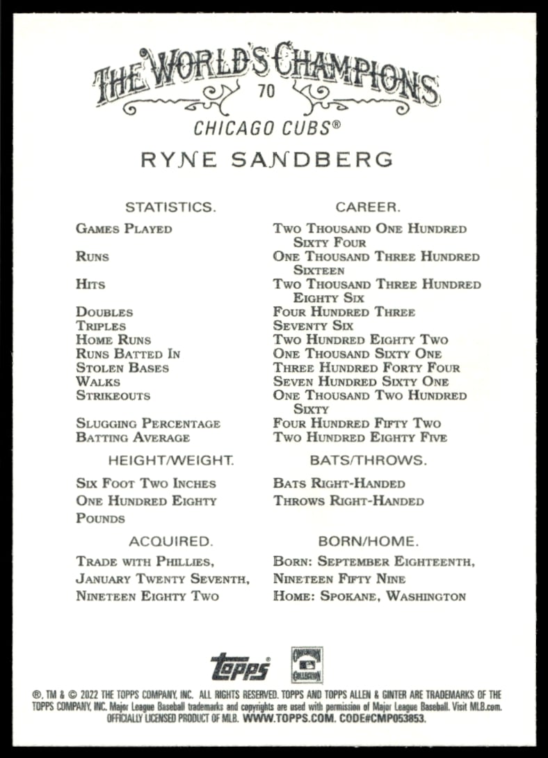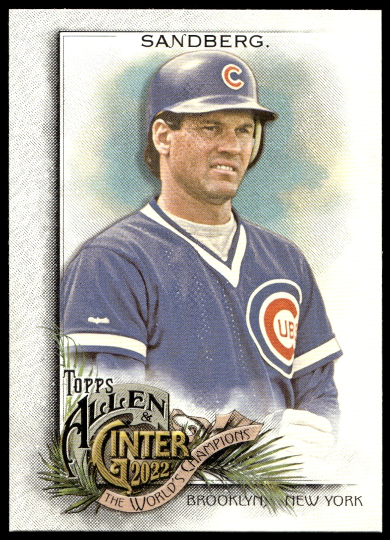 This BaseballΒ card, from 2022 is part of the Topps Allen & GinterΒ card set. Ryne Sandberg is featured and has a card number of 70.