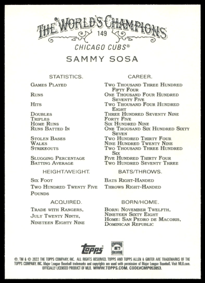This BaseballΒ card, from 2022 is part of the Topps Allen & GinterΒ card set. Sammy Sosa is featured and has a card number of 149.