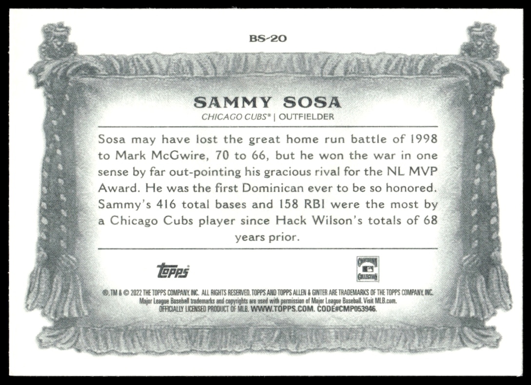 This BaseballΒ card, from 2022 is part of the Topps Allen & GinterΒ card set. Sammy Sosa is featured and has a card number of BS-20.