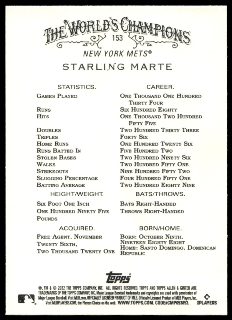 This Baseball card, from 2022 is part of the Topps Allen & Ginter card set. Starling Marte is featured and has a card number of 153.