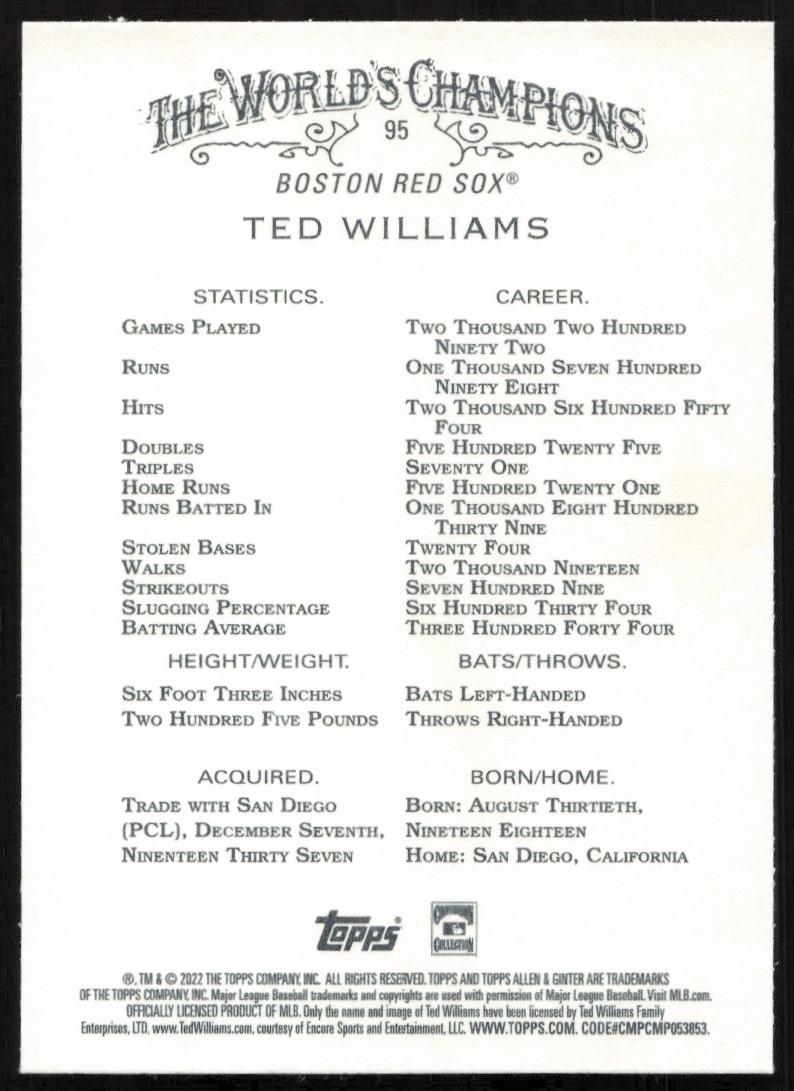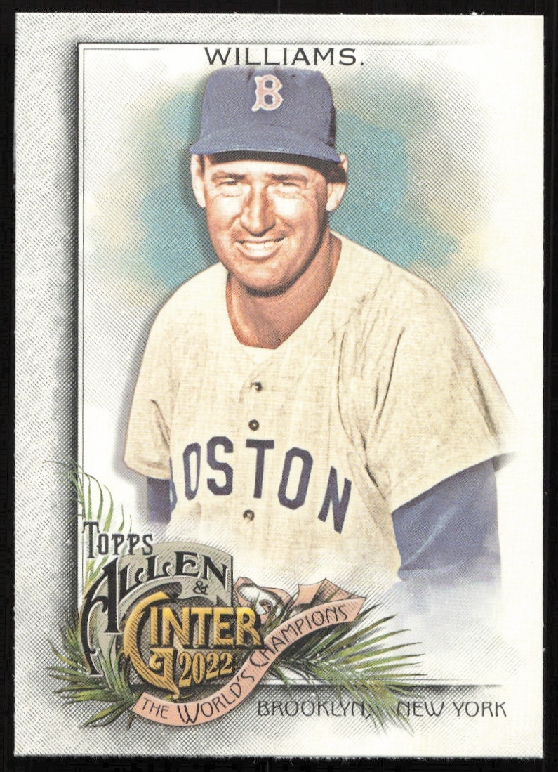 This Baseball card, from 2022 is part of the Topps Allen & Ginter card set. Ted Williams is featured and has a card number of 95.
