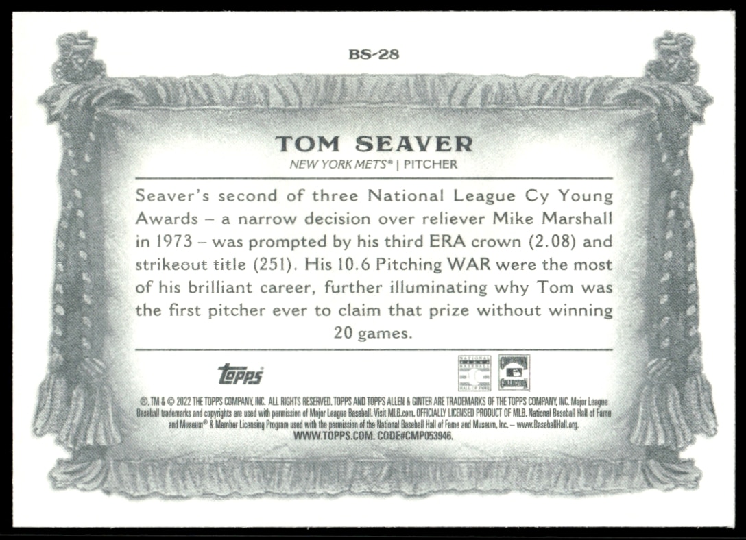 This Baseball card, from 2022 is part of the Topps Allen & Ginter card set. Tom Seaver is featured and has a card number of BS-28.